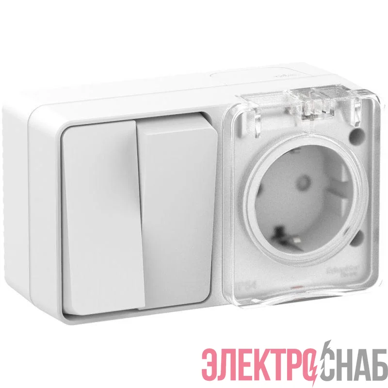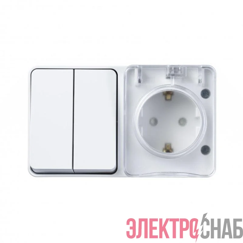 Блок для открытого монтажа из розетки с заземлением со шторками (16А, 250В) и 2-клавишного выключателя (10А).