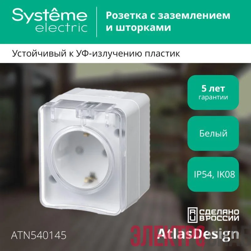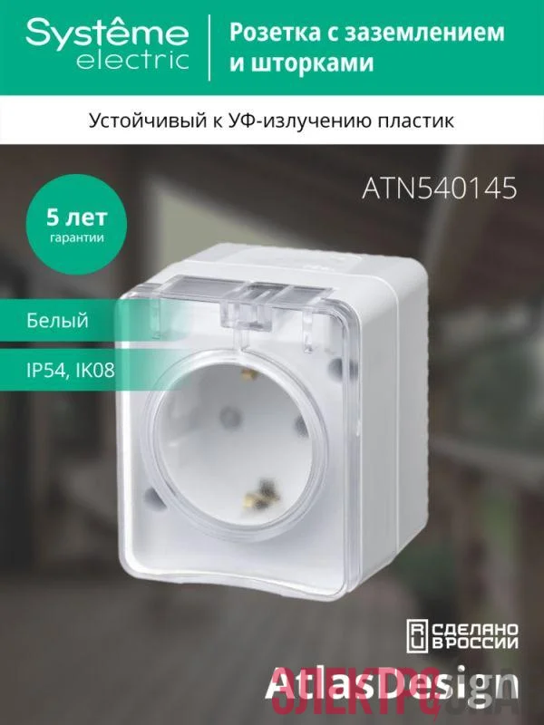 Степень защиты IP:54, Степень защиты IK: IK08. Продукция AtlasDesign Profi54 созданы специально для тех мест, где требуется повышенная защита от влаги и пыли. Уютная веранда в загородном доме, уличное кафе, любимый гараж или мастерская – выключатели и розетки будут обеспечивать надежную защиту и радовать глаз современным дизайном. Универсальный белый цвет гармонично впишется в любую обстановку.