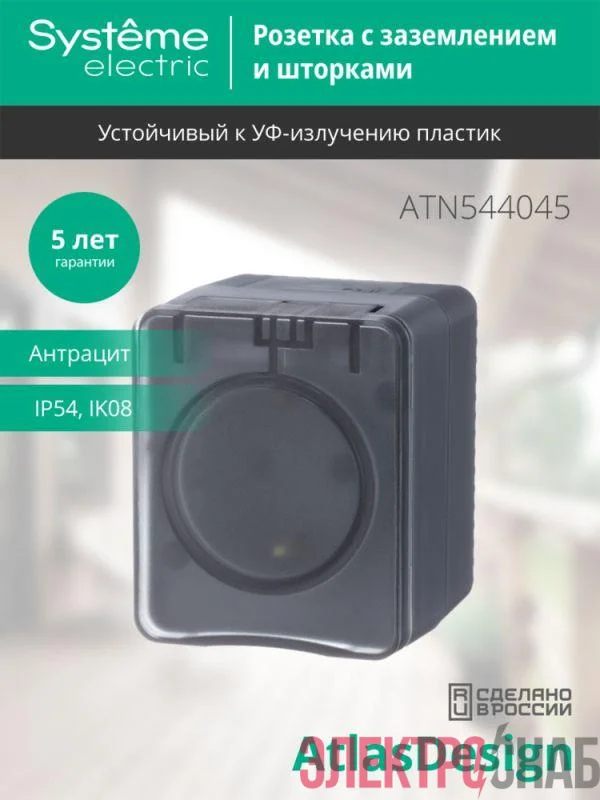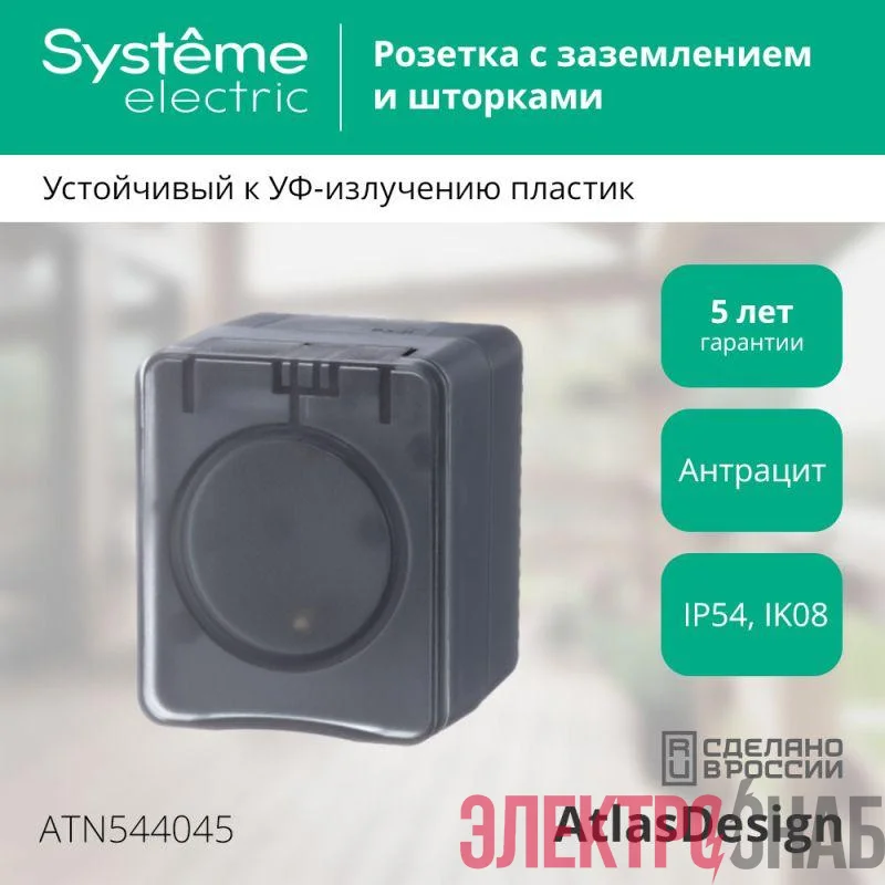 Степень защиты IP:54, Степень защиты IK: IK08. Продукция AtlasDesign Profi54 созданы специально для тех мест, где требуется повышенная защита от влаги и пыли. Уютная веранда в загородном доме, уличное кафе, любимый гараж или мастерская – выключатели и розетки будут обеспечивать надежную защиту и радовать глаз современным дизайном. Элегантный цвет антрацит гармонично впишется в любую обстановку.