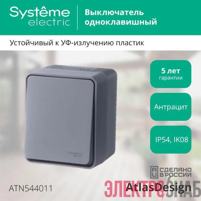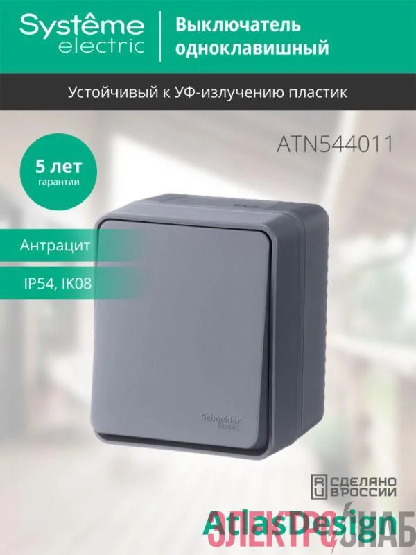 Степень защиты IP:54, Степень защиты IK: IK08. Продукция AtlasDesign Profi54 созданы специально для тех мест, где требуется повышенная защита от влаги и пыли. Уютная веранда в загородном доме, уличное кафе, любимый гараж или мастерская – выключатели и розетки будут обеспечивать надежную защиту и радовать глаз современным дизайном. Элегантный цвет антрацит гармонично впишется в любую обстановку.