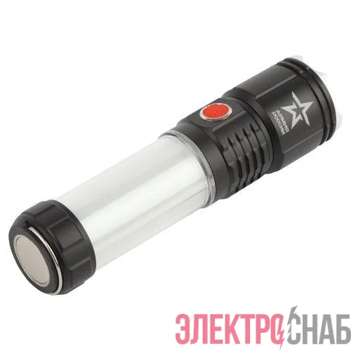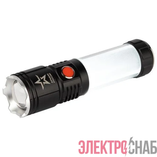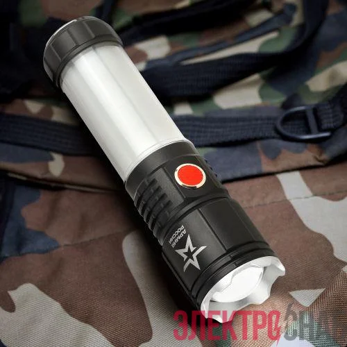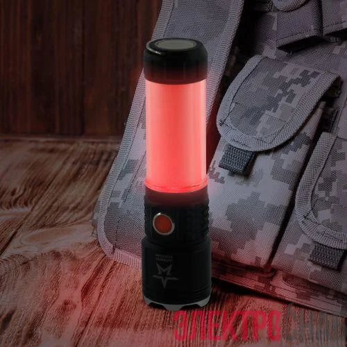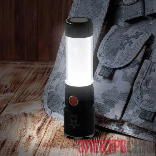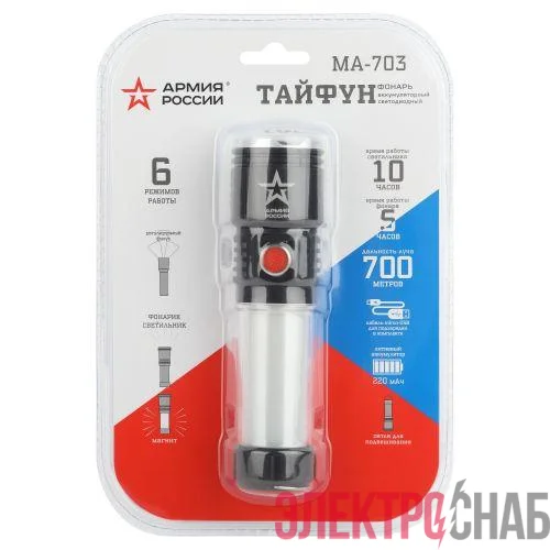ЭРА Армия России "Тайфун" МА-703 - универсальный светодиодный аккумуляторный фонарь с лучом повышенной дальности, пятикратным зумом и встроенным светонакопителем. Его легко найти в темном помещении или в траве - после выключения сохраняет небольшое свечение.