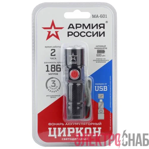 ЭРА Армия России Циркон - аккумуляторный светодиодный фонарь в высокопрочном корпусе из анодированного алюминия. Заряжается от USB, оснащён фокусировкой нового поколения - от ближнего заливающего света до направленного луча повышенной дальности (186 метров). По сути это 3 фонаря в одном компактном гаджете. Стильный лаконичный дизайн с фирменной звездой "Армия России". ЭРА Циркон не боится коррозии, долговечен и прост в уходе.Анодированное покрытие сохраняет фонарь в идеальном состоянии после долгих лет использования. Литиевый аккумулятор мощностью 600 мАч обеспечивает оптимальную ёмкость для универсального карманного источника света. Этот компактный фонарь удобно использовать в быту, брать с собой в путешествия, хранить в автомобиле. Красивая брендированная блистерная упаковка делает ЭРА Циркон отличным подарком мужчине любого возраста и социального положения. А история названия - дополнительный повод полюбить этот гаджет. Циркон - российская гиперзвуковая противокорабельная крылатая ракета с уникальной скоростью и дальностью полёта. Серия фонарей ЭРА Армия России - совместный проект отечественного бренда ЭРА и АО "Военторг", действующего на основании лицензии Министерства обороны РФ.