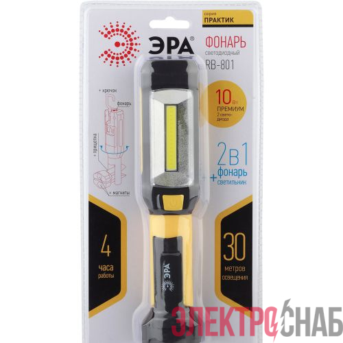 Б0027823 | Фонарь RB-801 рабочий "Практик" 6Вт COB+4Вт 3хAAA магнит крючок прищепка 720гр блист. ЭРА