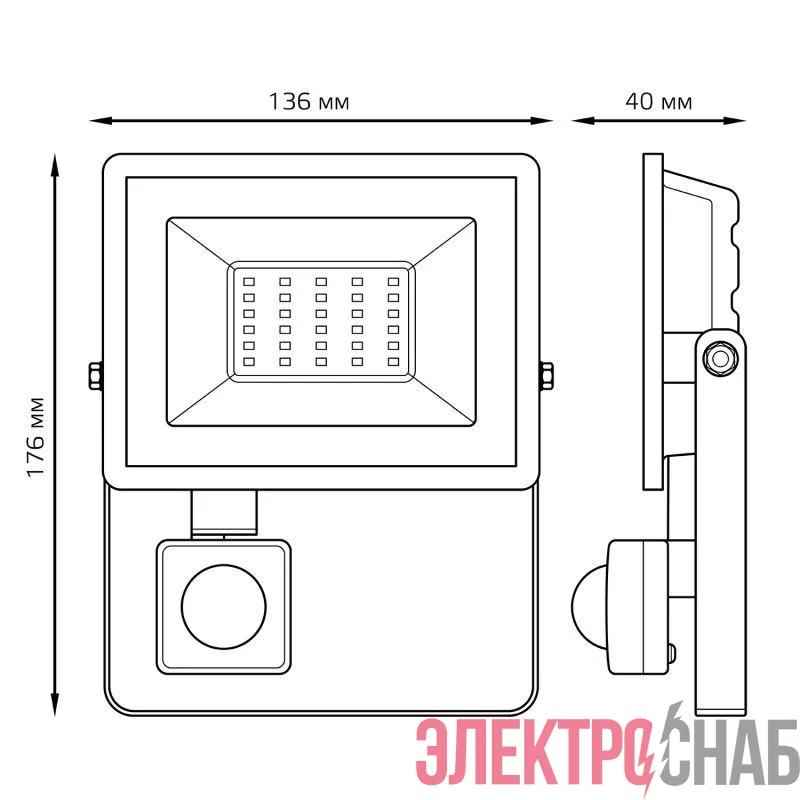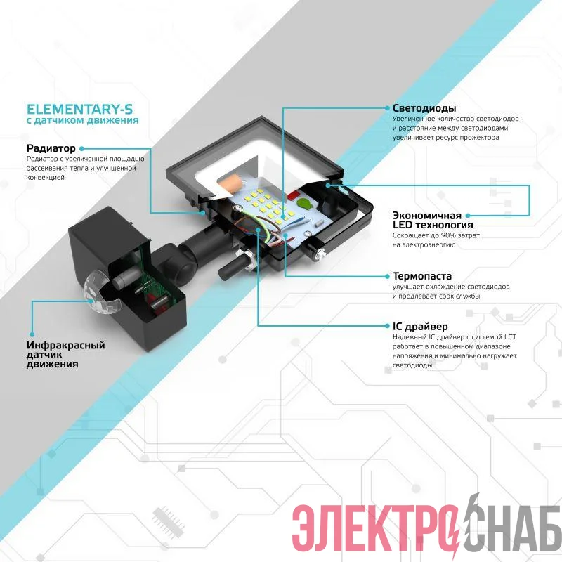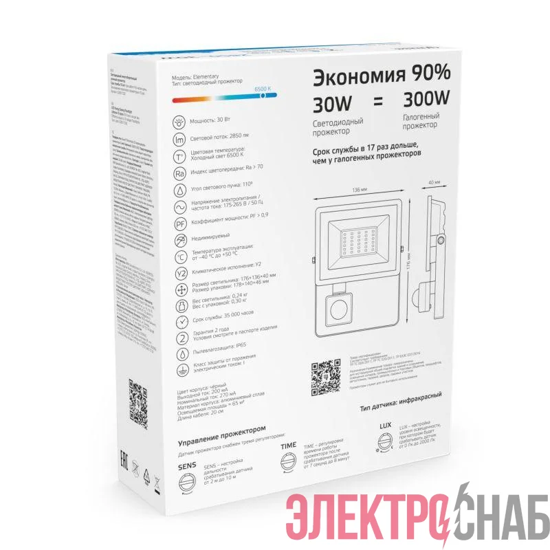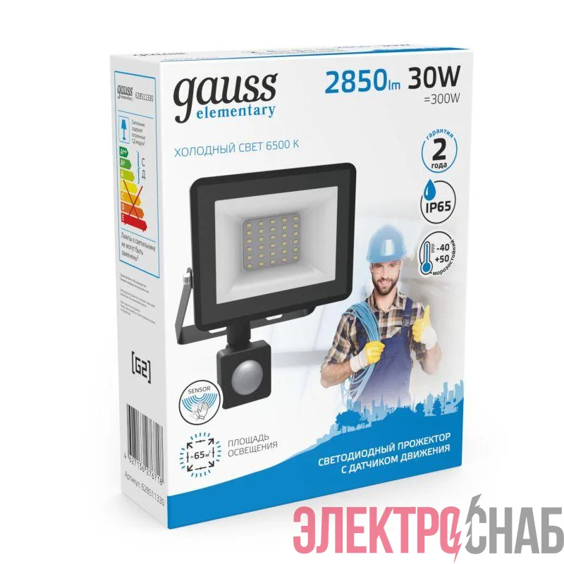 Прожектор светодиодный Elementary 30Вт 6500К IP65 2100лм 175-265В ДО с датчиком движения черн. GAUSS 628511330