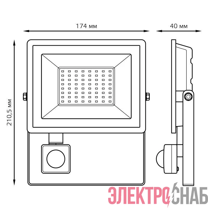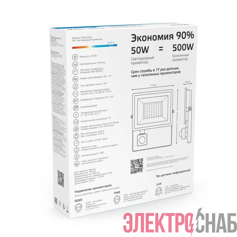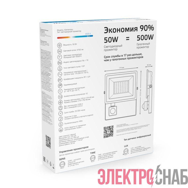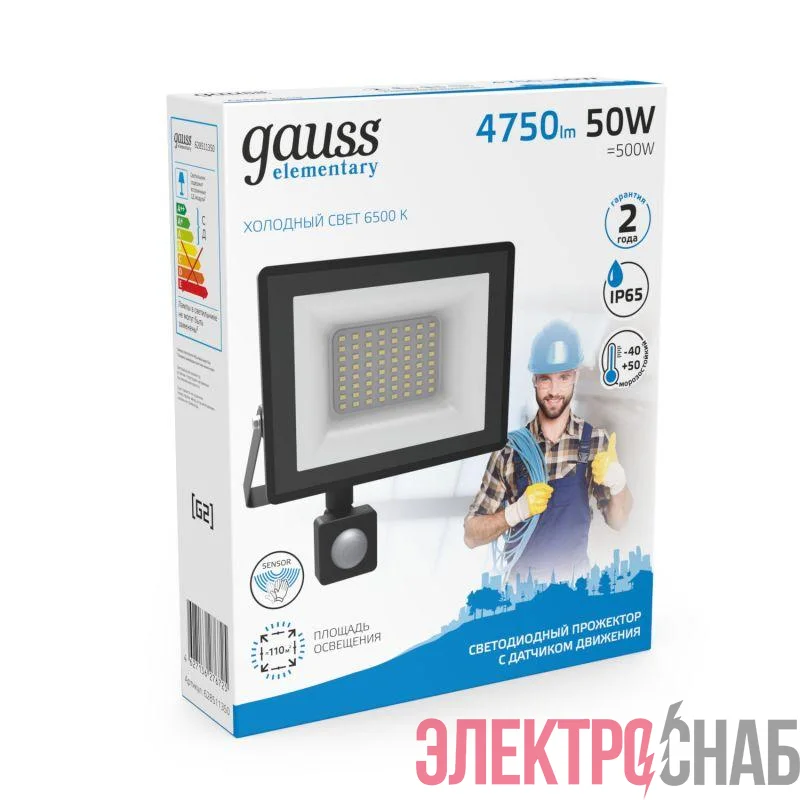 628511350 | Прожектор светодиодный Elementary 50Вт 6500К IP65 3450лм 175-265В ДО с датчиком движения черн. GAUSS