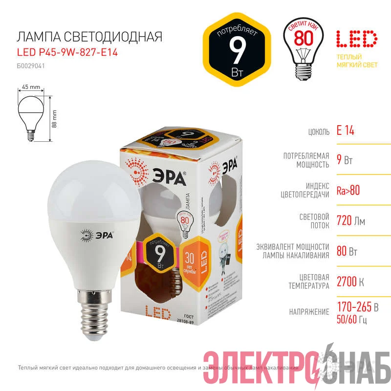 Лампа светодиодная P45-9w-827-E14 шар 720лм ЭРА Б0029041