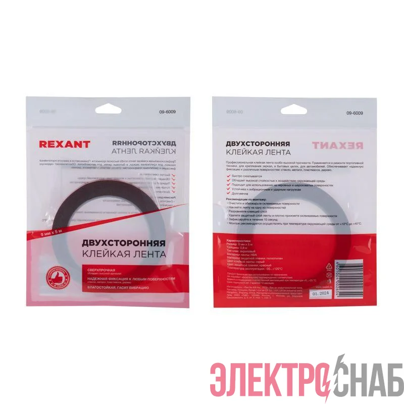 09-6009 | Скотч двустор. 9ммх5м красн. на серой основе REXANT