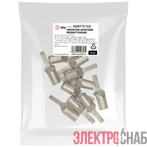 Наконечник штифтовой медный луженый НШМЛ 70-7х25 используется для оконцевания проводов и кабелей с медными жилами сечением до 70 мм? и применяется для кабелей напряжением до 1 кВ. Позволяют осуществлять подключение кабелей и проводов, сечение жил которых превышает размеры контактных клемм, при подключении к выводам автоматических выключателей и других устройств имеющих ограниченную ширину контактных клемм. Наконечники НШМЛ изготавливаются из меди марки М1. Высококачественное лужение с легирующими добавками висмута и олова гарантирует надежную защиту контактных соединений от коррозии (климатическое исполнение Т2). Для оконцевания проводников необходимо использовать специальный обжимной инструмент.
