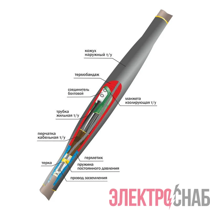 Универсальные болтовые соединители со срывными головками, входящие в комплект кабельной муфты, подходят для кабелей как с алюминиевыми, так и с медными жилами. Комбинированный комплект заземления предусматривает крепление провода заземления к металлическим оболочкам соединяемых кабелей с применением роликовых пружин постоянного давления и контактных терок, а к бронелентам - методом пайки. Обладает необходимым уровнем устойчивости к воздействию агрессивных внешних факторов.