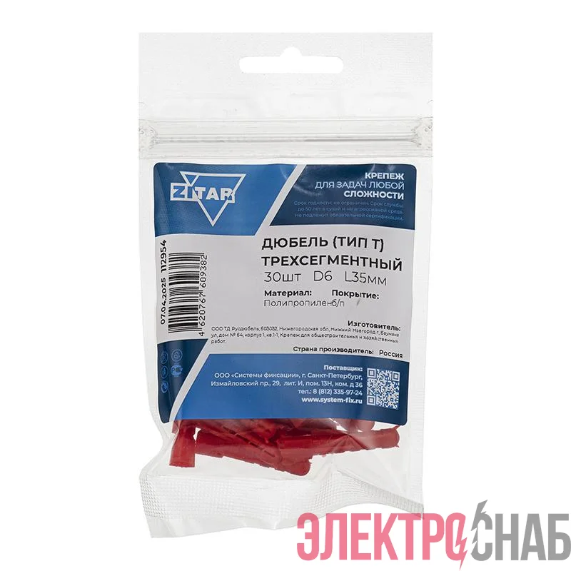 112954 | Дюбель распорный 6х35 трехсегментный (тип Т) (уп.30шт) пакет Tech-Krep